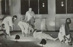 En esta foto de una revista francesa de mediados de 1930, Feldenkrais muestra cuatro posiciones en el rollo delantero (zenpo kaiten)